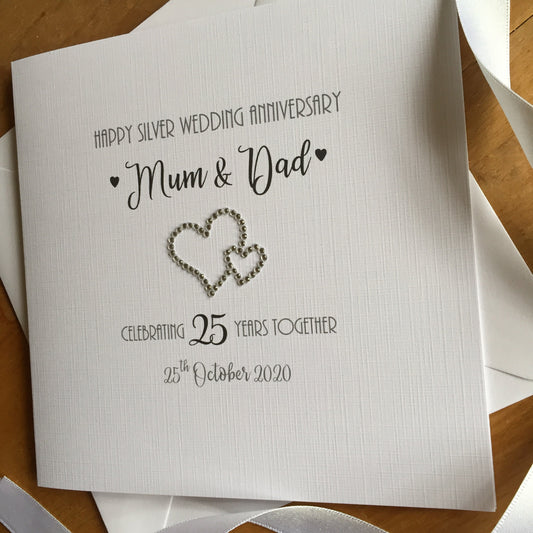 Silver 25th Wedding Anniversary Card - Double Diamante Hearts - 25th Anniversary Card, Silver Wedding
