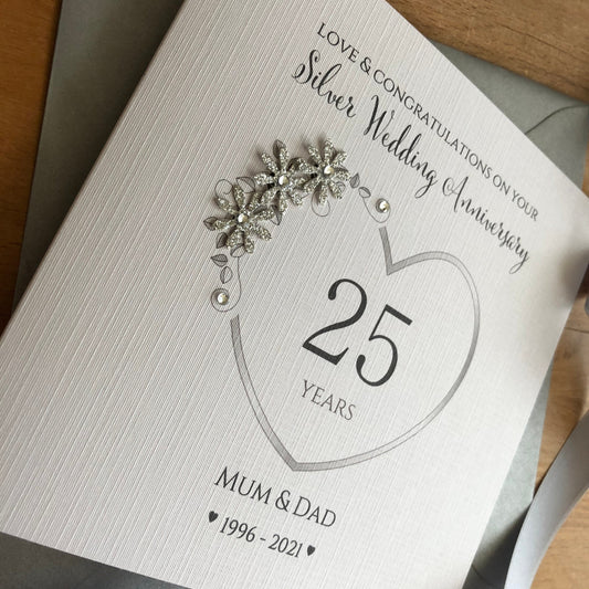 Silver 25th Wedding Anniversary Card, Floral Number Heart, 25 Years Personalised