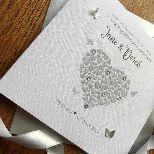 Silver 25th Wedding Anniversary Card - Heart of Hearts & Butterflies
