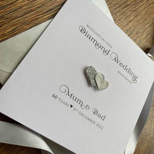 Personalised Diamond, Platinum, Silver Wedding Anniversary Card - 60 Years, 70 Years, 25 Years - Double Glitter Hearts