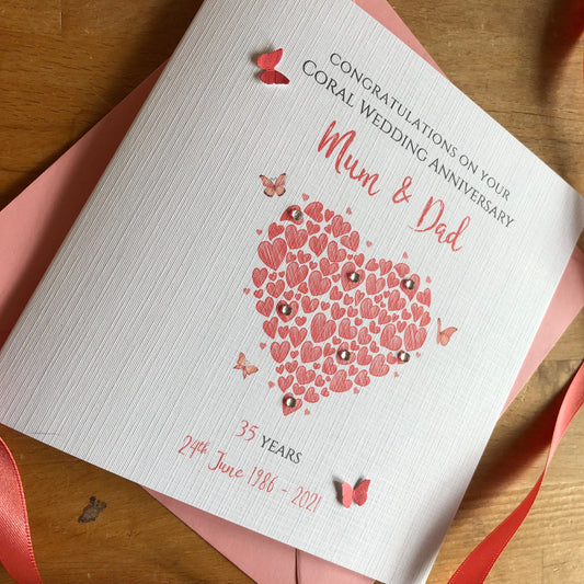 Personalised Coral Wedding Anniversary Card, Heart of Hearts with Butterflies