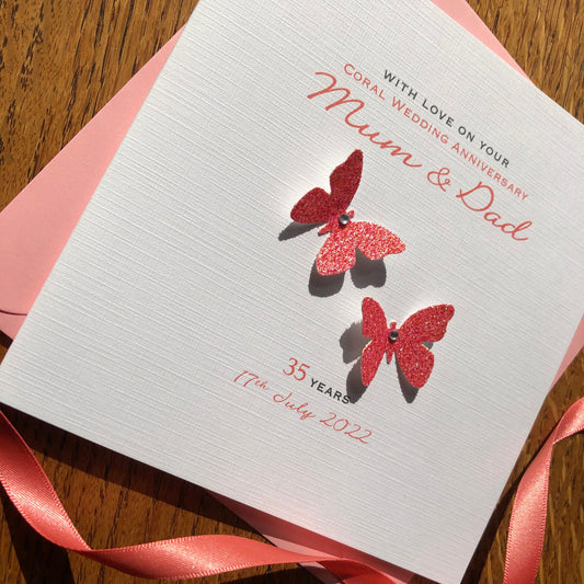 Coral 35th Wedding Anniversary Card, Coral Glitter Butterflies, Personalised
