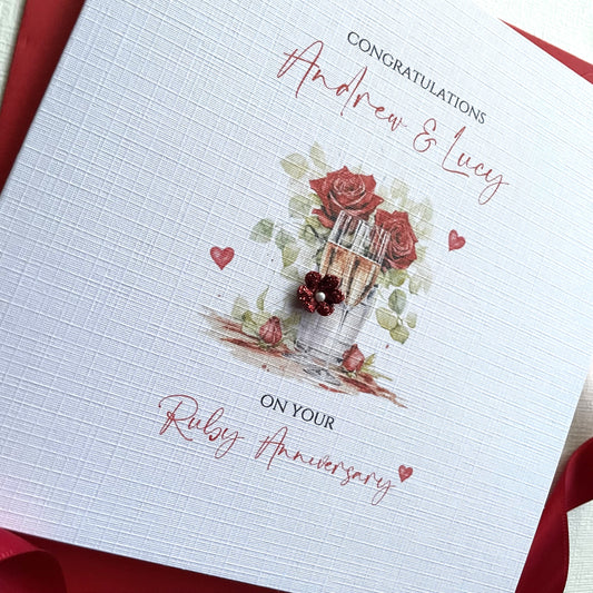 Ruby Wedding Anniversary Card, 40th, Champagne & Roses Personalised Card, 40 Years Personalised Anniversary