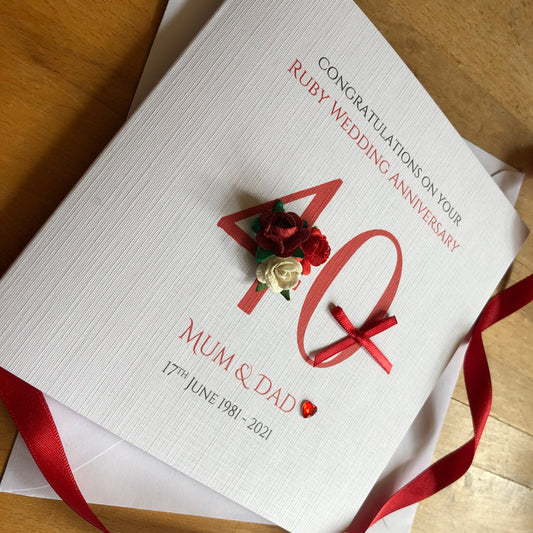 Ruby 40th Wedding Anniversary Card - Large Number with Rose Cluster - Personalised