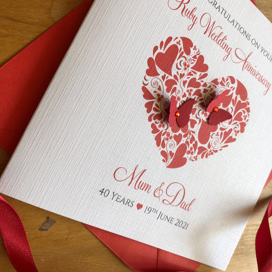 Ruby Wedding Anniversary Card, Heart of Hearts & Butterflies - Personalised