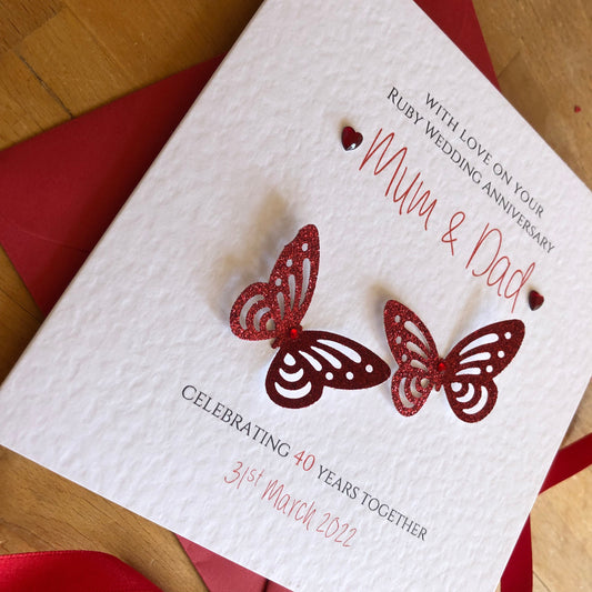 Ruby Wedding Anniversary Card, 40th Anniversary Glitter Butterflies - Personalised