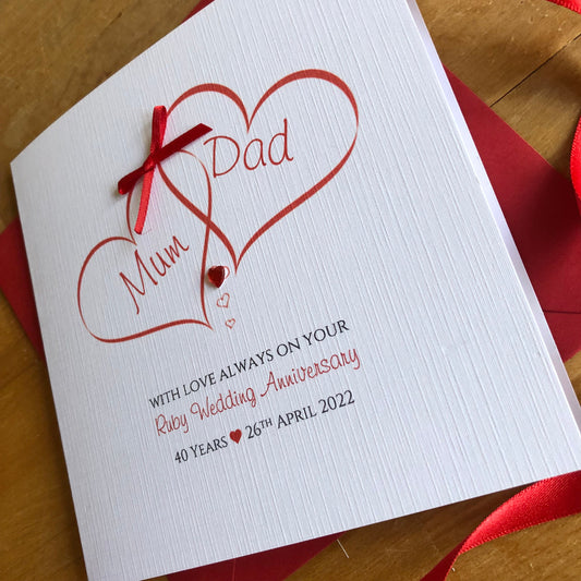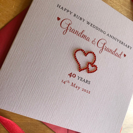 Ruby Wedding Anniversary Card, Ruby Crystal Entwined Hearts, 40th Anniversary - Personalised