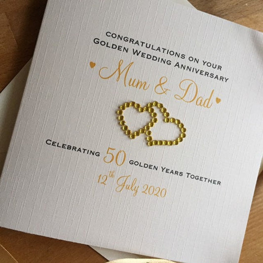 Personalised Golden 50th Wedding Anniversary Card - Diamante Double Hearts