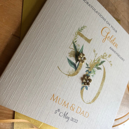 Golden 50th Wedding Anniversary Card, Glitter Flowers - Personalised