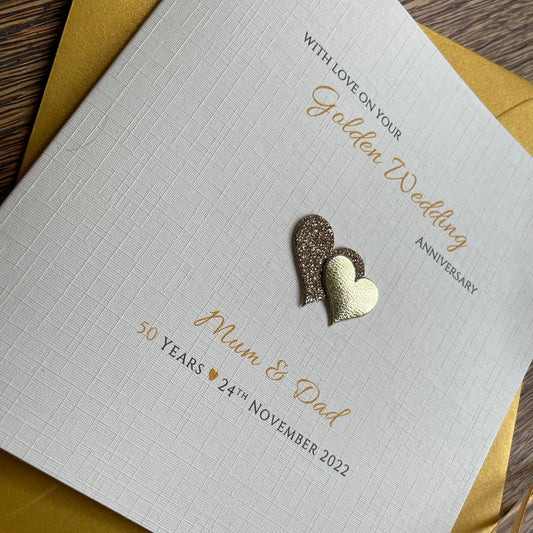 Personalised Golden Wedding Anniversary Card, Gold Double Glitter Hearts