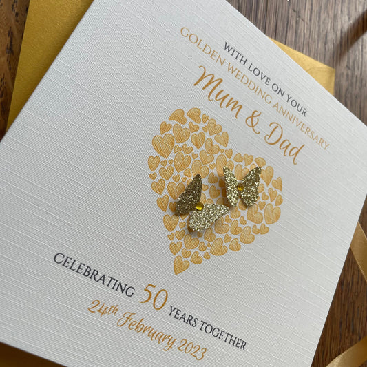 Personalised Golden Wedding Anniversary Card - Heart of Hearts & Butterflies