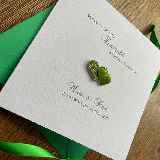 Personalised Emerald Wedding Anniversary Card, 55 Years Married - Double Glitter Hearts