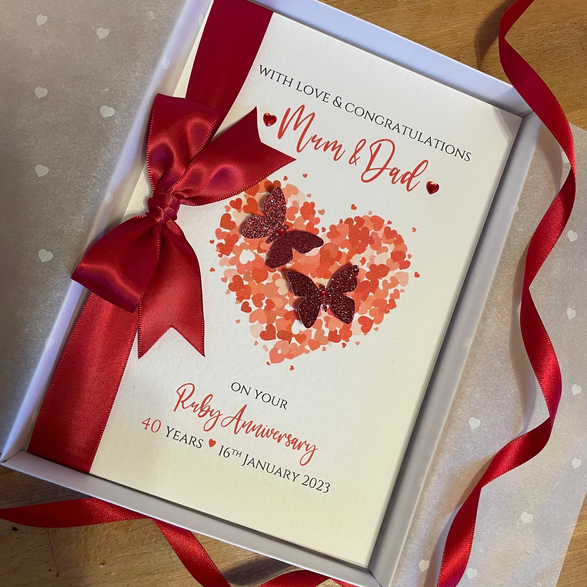 Luxury Ruby Wedding Anniversary Card, Personalised 40th Anniversary, Hearts & Butterflies - Boxed